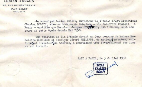 En 1950 à l’âge de 17 ans mon papa est parti à Paris pour suivre les cours de CHARLES DULLIN.